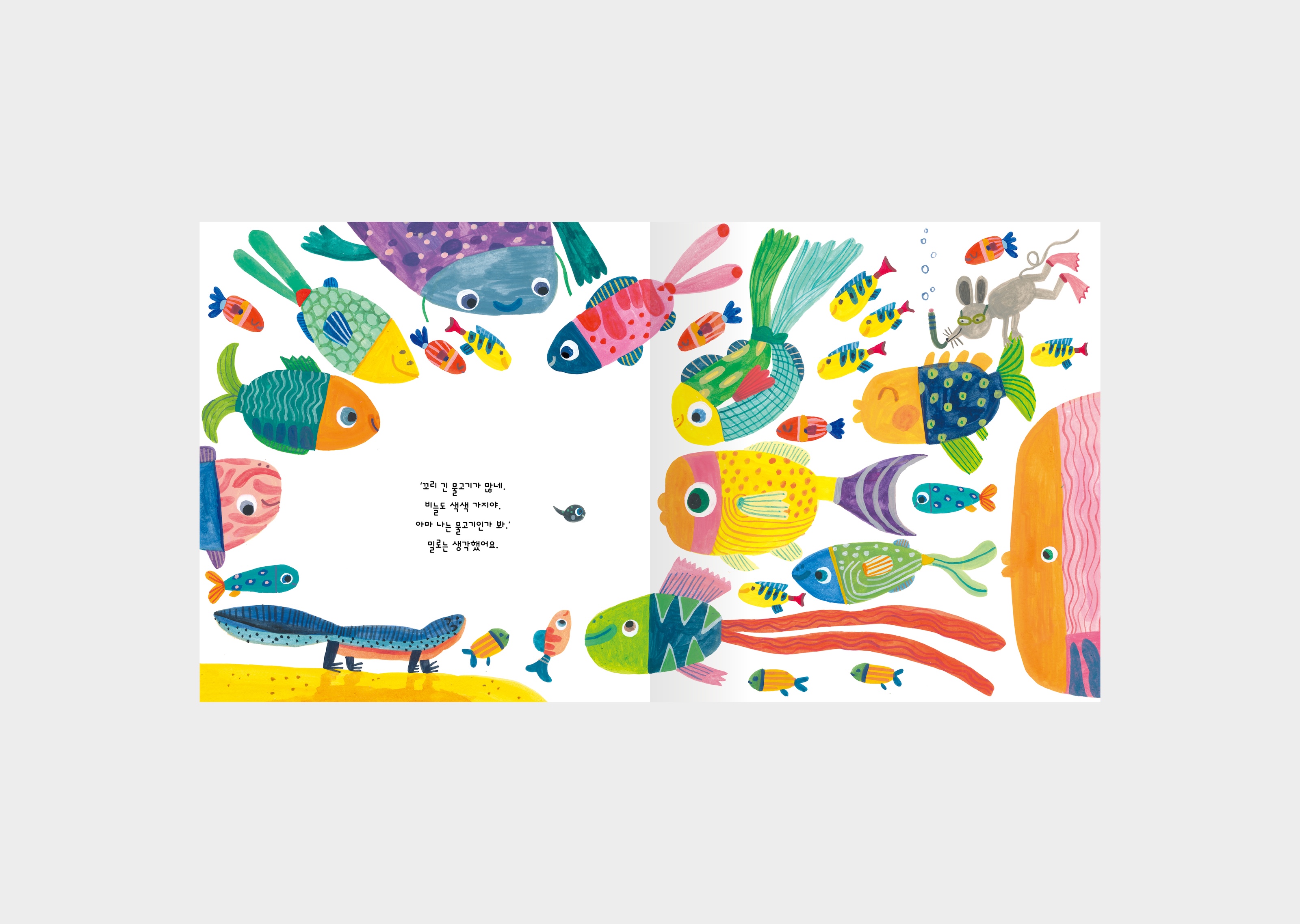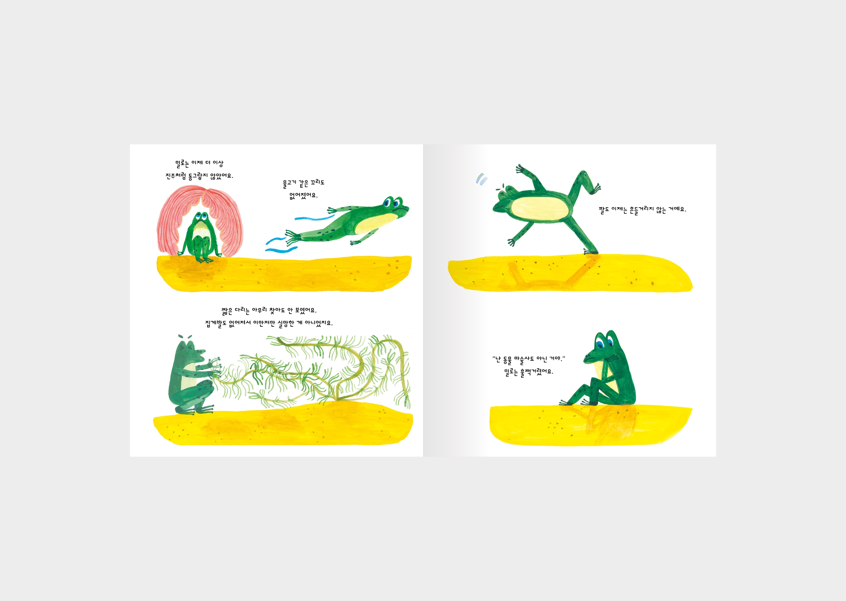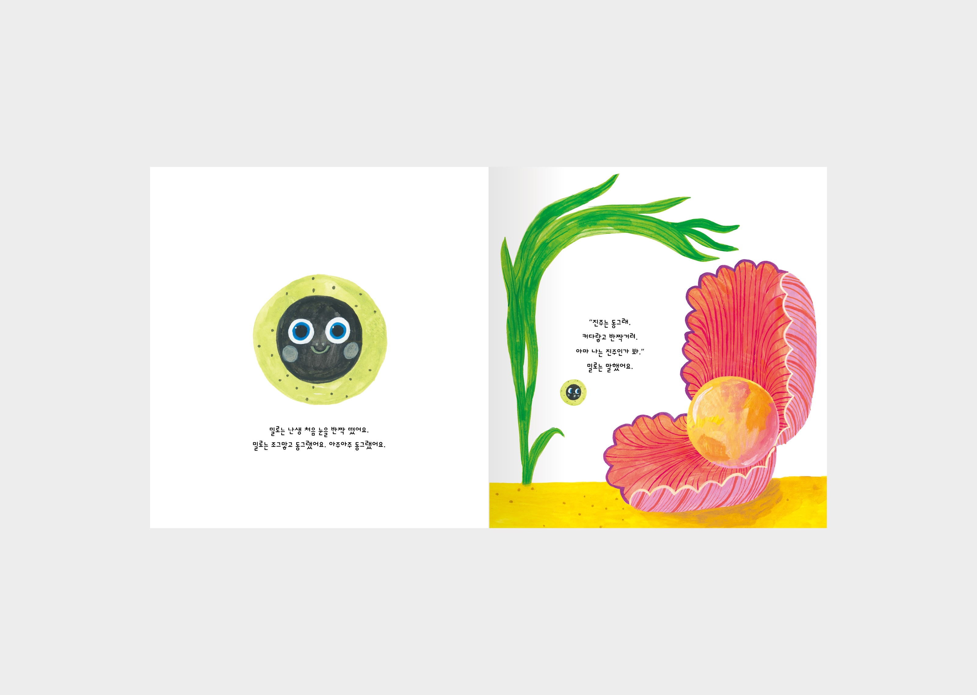 그림책 『밀로』를 디자인했습니다. 어느 날, 물 속에서 눈을 뜬 작고 동그란 밀로는 점차 모습이 변합니다. 변해가는 자신의 모습을 통해 밀로는 자신이 누구인지 알아갑니다. 밀로는 누구일까요?